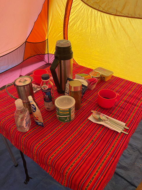 Glücklich über den erlebnisreichen Tag, steigen wir den steilen Weg hinunter zum Camp am Lake Carhuacocha (4'150 m), wo unser Lager vom Gaucho Allende bereits vollständig eingerichtet ist: unser Zelt auf dem bestmöglich ebenen Platz aufgebaut.